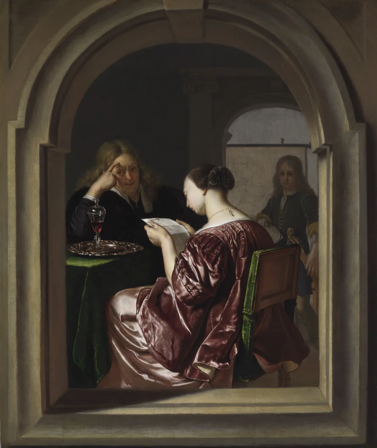 Een vrouw leest in de Oprechte Haerlemsche Courant op een schilderij (omstreeks 1676) van Frans van Mieris (1635-1681) [via WIkimedia Commons]