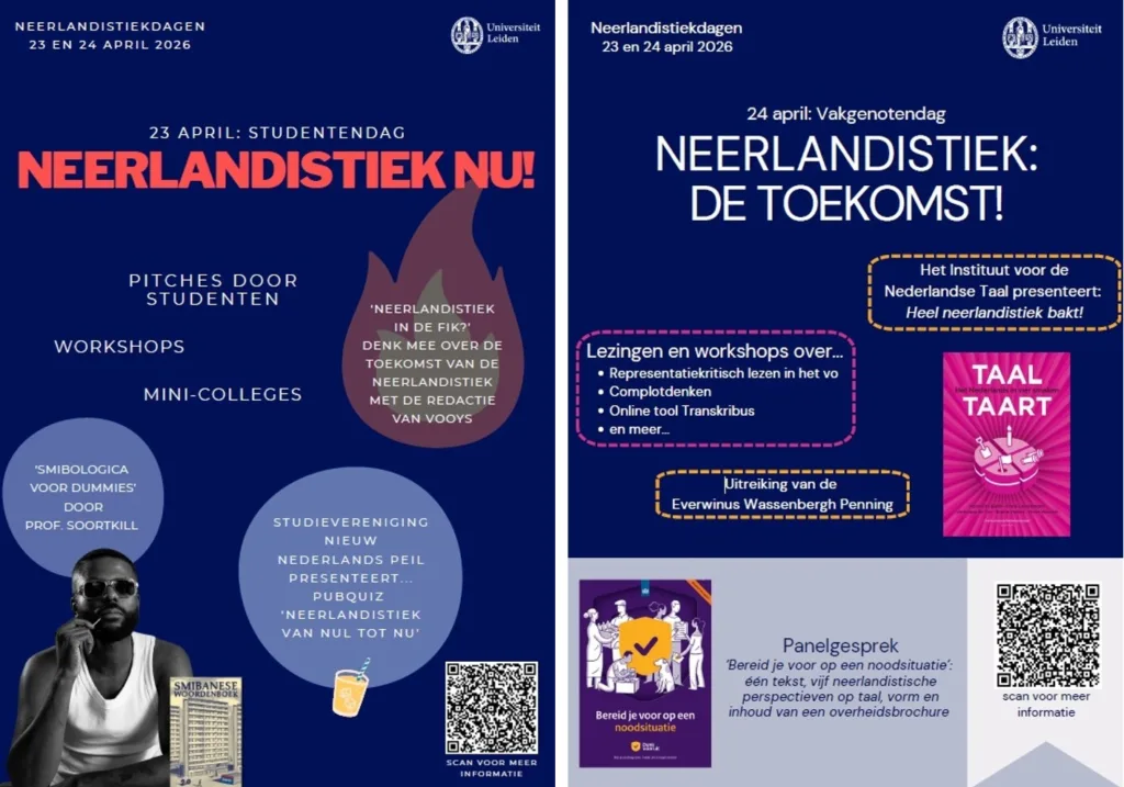 Op donderdag 23 en vrijdag 24 april 2026 vindt de zesde editie van de Neerlandistiekdagen plaats aan de Universiteit Leiden. De eerste dag is de Studentendag met als motto ‘Neerlandistiek nu!’; de tweede dag, ‘Neerlandistiek: de toekomst!’ is bedoeld voor vakgenoten, alumni en andere belangstellenden.