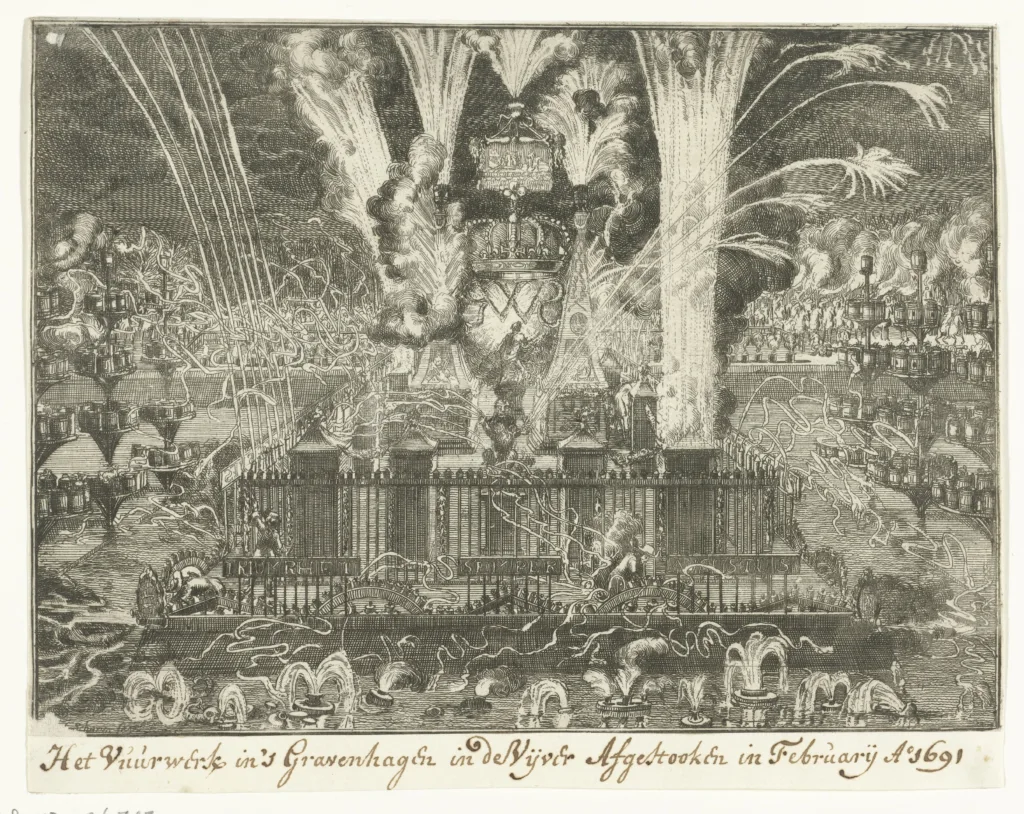 Vuurwerk ter ere van de intocht van Willem III in Den Haag (1691) [via Rijksstudio]