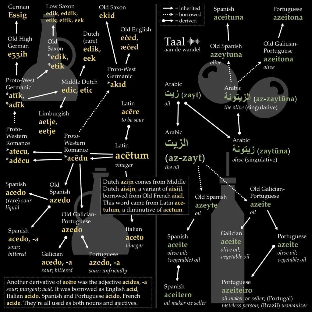 De vorm azijl is eigenlijk de oorspronkelijke. Het komt uit het Oudfranse aisil, dat op zijn beurt teruggaat op het Latijnse acetulum of acetilum – verkleinvormen van acetum, wat ‘zuur’ betekent. Die betekenis van zuur ligt nog altijd aan de basis van het woord azijn.