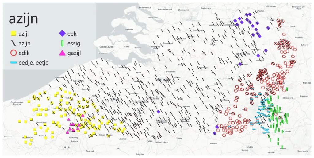 Azijn is het huidige standaardwoord in het Nederlands, maar komt ook in vele dialecten voor. In Frans- en West-Vlaanderen hoor je daarnaast regelmatig azijl (uitgesproken als aziel), en soms ook gazijl (of gaziel), bijvoorbeeld in de omgeving van Kortrijk.