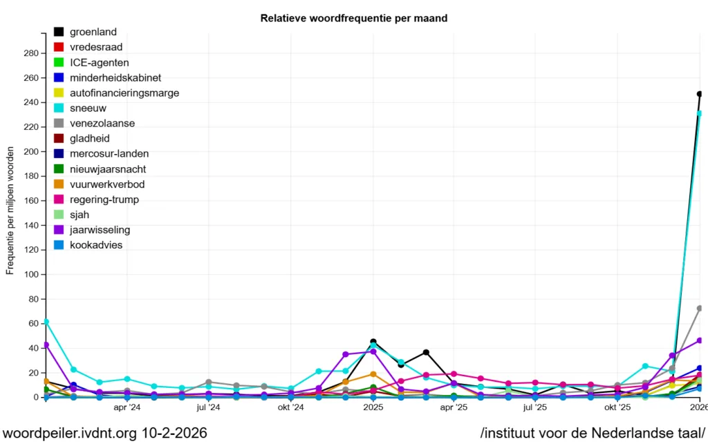 Welke woorden zijn het meest kenmerkend voor de afgelopen periode? Maandelijks brengen we een Woordpeiling uit op basis van een data-analyse van zo’n tien miljoen krantenartikelen uit de periode 2000 tot nu uit het Corpus Hedendaags Nederlands (CHN). Samen vertegenwoordigen die teksten ruim drie miljard woorden. Per maand analyseert het INT hoe vaak woorden voorkomen, hoe hun gebruik zich in de voorafgaande jaren ontwikkelt en in welke mate ze tijdelijk pieken.